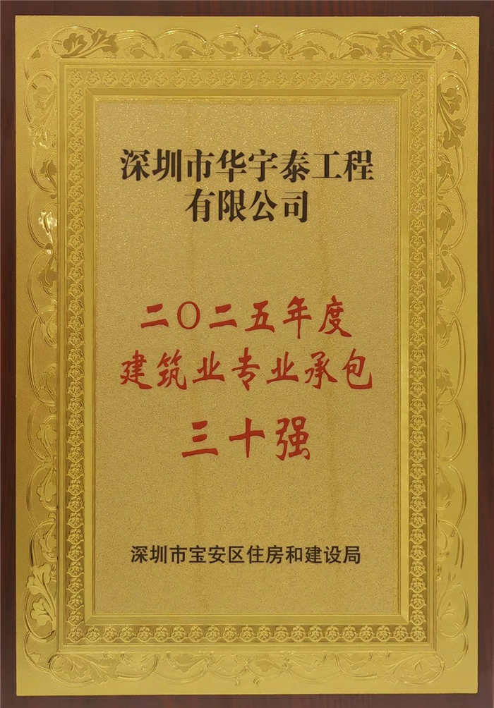 2026年3月13日,深圳市华宇泰工程有限公司应邀参加由宝安区住房和建设局组织举办的“宝安区建设领域专题工作会议”。会上,区住建局正式公布了《2025年宝安区建筑业专业承包三十强企业名单》,华宇泰工程有限公司凭借稳健的经营业绩、良好的履约表现和积极的社会责任担当,成功入选该榜单,展现了公司在行业内的专业实力和良好口碑。